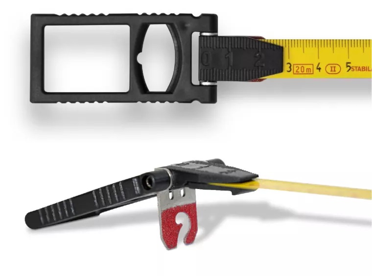 Le crochet universel du mètre à ruban à cadre LBM 1000 et du mètre à ruban à capsules LBM 2000 offre des possibilités de fixation flexibles grâce au crochet STABILA SPIKES dépliable et au grand anneau en plastique incassable avec encoche à clou - pour un maintien sûr lors du tirage du ruban. L'œillet de clouage intégré dans le crochet SPIKES permet de desserrer rapidement la fixation.